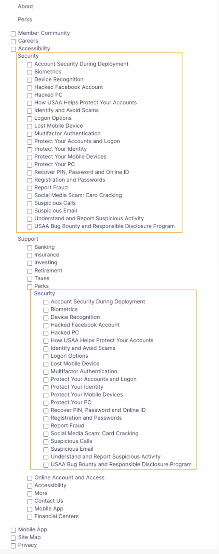 Content from 22 Security Center pages were consolidated to create a total of 10 pages, which were distributed between three main categories: Advice (located in the global nav), Security, and Support (both in footer nav)